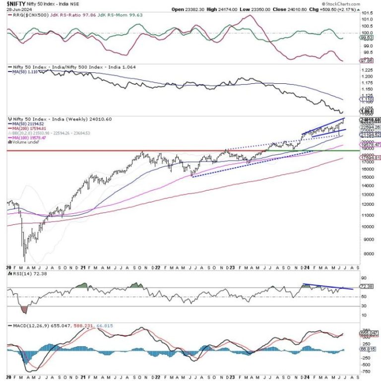 It is also important to note that the markets have again run too hard and ahead of themselves. The nearest MA, i.e., 20-week MA is currently placed at 22594 which is over 1400 points below the current close. The 50-week MA is placed at 21194 which is over 2800 points below the current close. This means that even if there is the slightest mean reversion taking place, we may see the markets coming off significantly from the current levels. If it does that, even then, it will keep its primary uptrend intact. Monday is likely to see a muted start to the week; the levels of 24200 and 24350 are likely to act as immediate resistance levels. The supports are likely to come in lower at 23900 and 23750 levels.